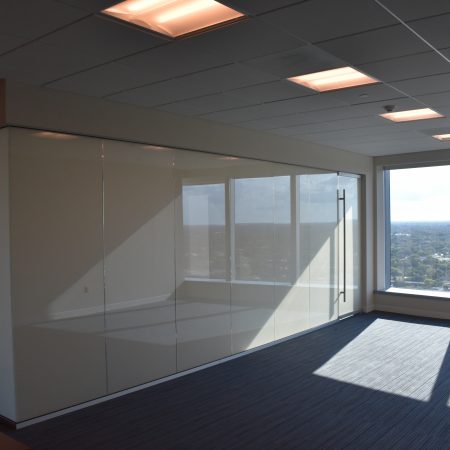 This installation required butt-glazed PrivacyVue® panels and a swing door with our custom power-transfer pivot assembly. Wireless switching was provided with the use of our PV-WS Series – PrivacyVue™ Wireless Handheld Remote.